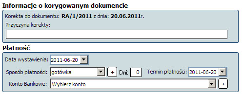 W oknie, które nam się pojawi mamy możliwość podania przyczyny korekty, daty wystawienia oraz sposobu płatności.
