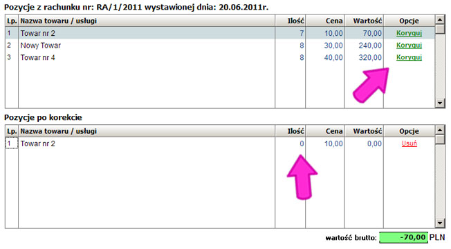 W następnym kroku przechodzimy do pozycji, które znajdują się na wcześniej wystawionym rachunku, z listy wybieramy pozycję, które chcemy korygować.