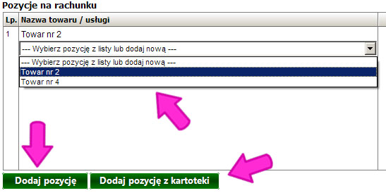 Ostatnim krokiem jest dodanie pozycji do wystawianego rachunku, pozycje można dodać Na trzy sposoby: